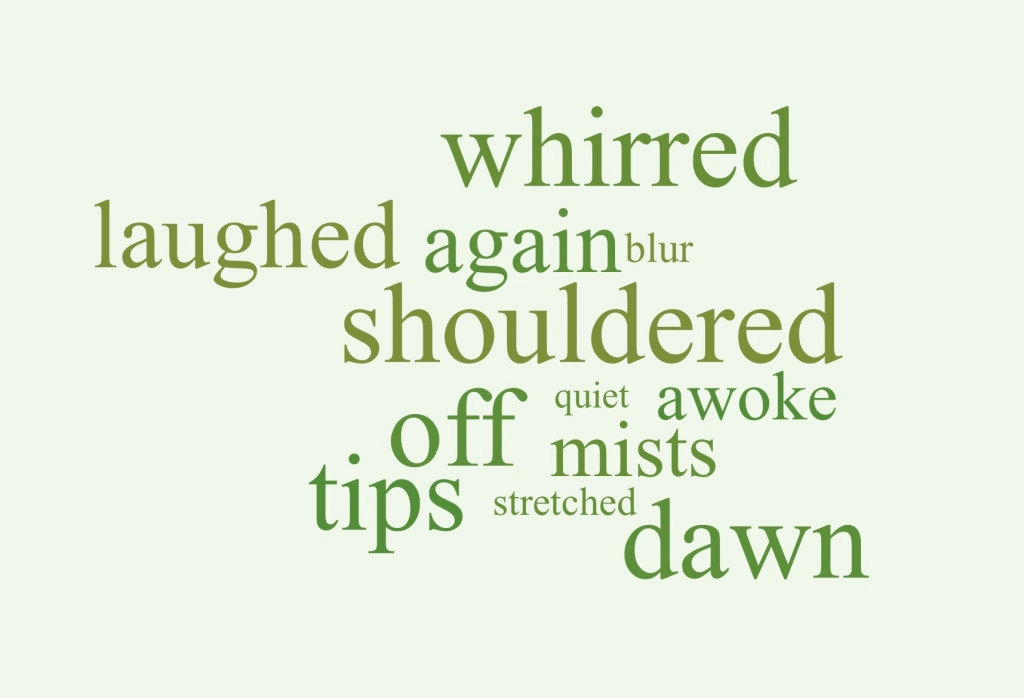 As the mists of dawn awoke the quiet, sleeping birds stretched the tips of their wings, a sang their first song. Energized, they whirred into the sky, their wings shouldered against the brazen breeze.