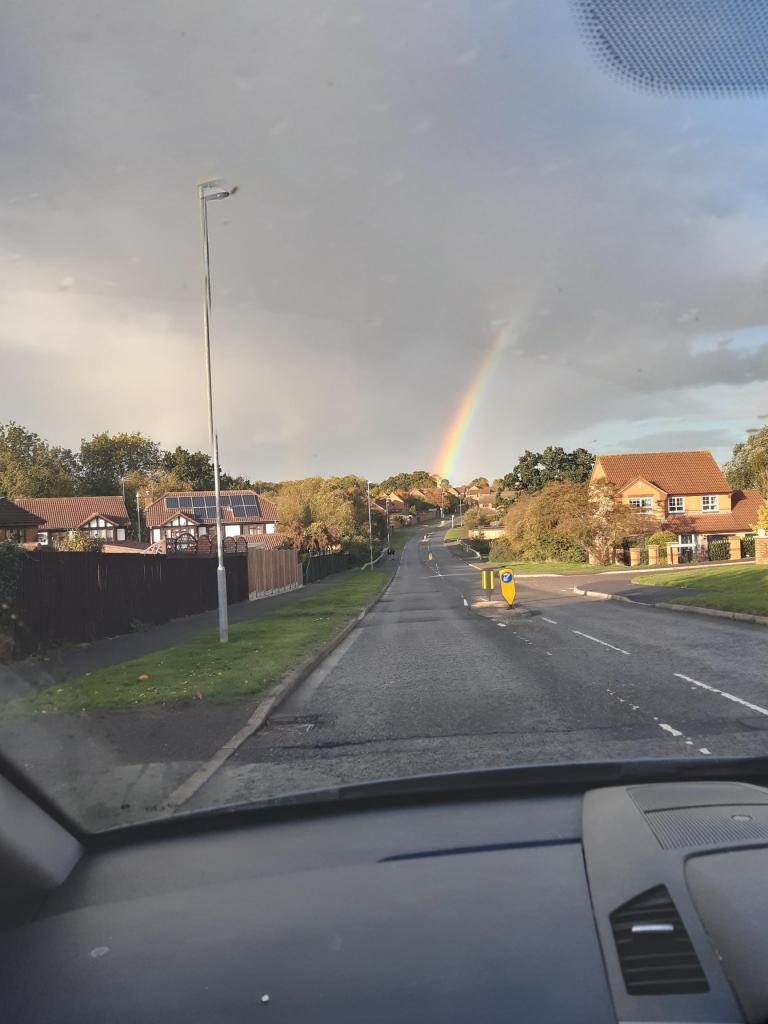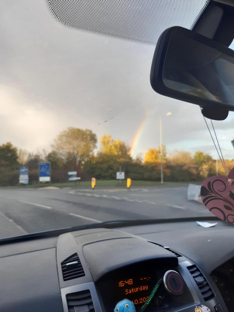 October 15th and my pictures today are of a rainbow I saw on my way home from shopping. I wonder if there is a pot of gold at the end of this colourful display. There was also a full rainbow, but I wasn’t able to take a picture. I love seeing a rainbow, as it always makes me think of that even in the rain, mother nature shines her love.